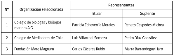 Hasta el momento, el Cosoc está integrado por representantes del Colegio de Biólogos Marinos, del Colegio de Mediadores de Chile y de la Fundación Mare Magnum, tal cual lo detalla el siguiente cuadro: